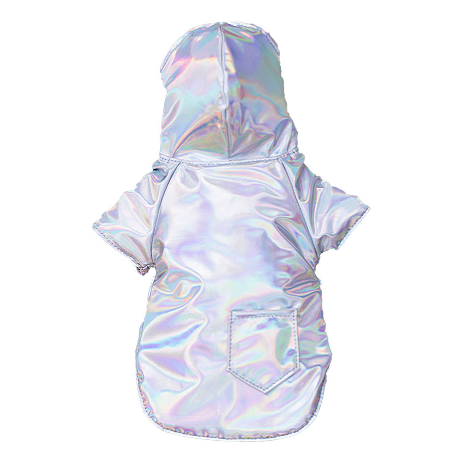- Abrigo impermeable plateado con un bonito efecto iridiscente que refleja los colores del arcoíris con la luz del sol.